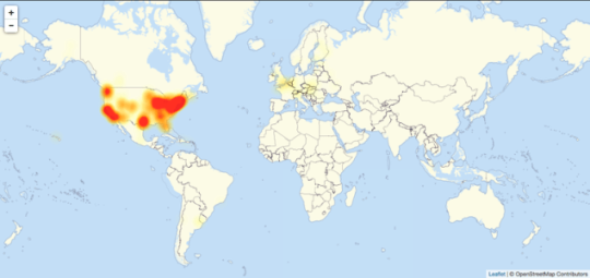 The outages were primarily across the United States. It was purposely done.. This map from DownDetector.com proving the denial of service hit..