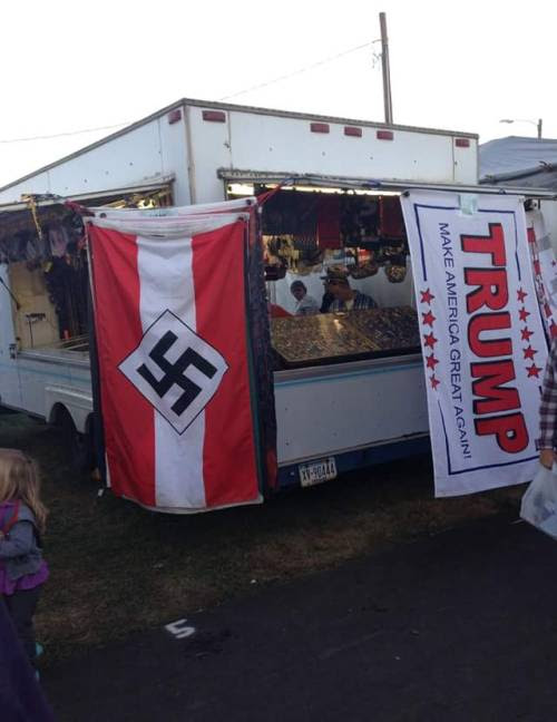 The image was taken by someone who visited the fair and was moved enough to publish her photo of the Nazi flag (next to the make America great again Trump banner) on the truck.. The vendor is selling items that include derogotive bumper stickers and other apparrel of controversial appeal..