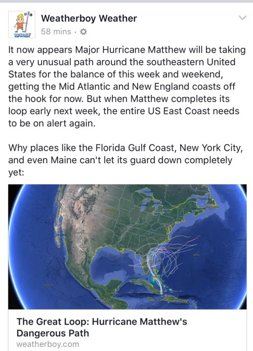 The lastest rash of spaghetti plots for where Hurricane Matthew may go… before it gets into ocean waters where it will decide if it swings back again, it is first going to make landfall on Florida and be enormous and deadly in scope..