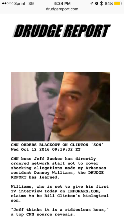 This is a screen shot from a report today on Drudge .. The big news of the campaign besides Wikileaks and sex-talk tapes: Alex Jones from INFOWARS calling Obama and Hillary demons and interviewing a man claiming to be Bill Clinton’s son.